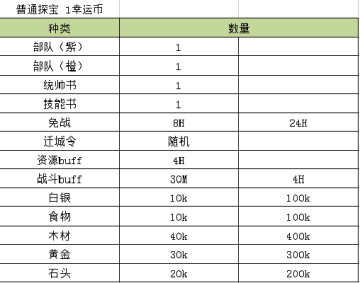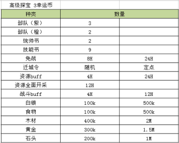 进行探宝以获得高阶兵种、统帅令牌、技能书、资源buff、增益buff等高级道具,并且100%中奖。分为普通探宝和高级探宝,普通探宝每次消耗1个幸运币或15钻石,每天登录后可以免费进行一次普通探宝。高级探宝每次消耗3个幸运币或45钻石。