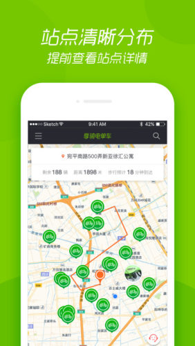 打开享骑电单车app软件首页后,在地图上客查看附近站点标识图标,点击站点图标,会显示对应的路线图以及站点图片。