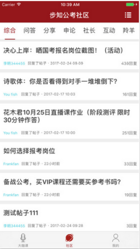 社区分享交流:直接参与步知公考社区,发帖回帖,与大咖老师直接互动交流,分享公考经验。