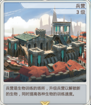 是生物训练的场所,升级兵营可以解锁新的生物,同时提高各种圣物的训练速度。