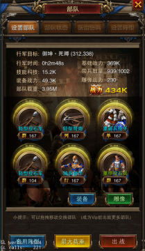 部署军队后,点击【出战】,部队就出发了,行军时间与玩家据点和目的地之间的距离相关,返回同理,如果不想等待可以用钻石加速行军。战斗结束后,会将战报以邮件的形式发送给玩家。