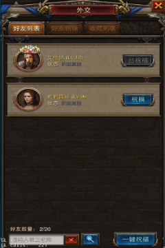 社交系统的界面有三个分页标签,分别是“好友列表”、“好友祝福”、“收藏列表”,好友列表的下方有搜索输入框,贴心的设计可以方便快速找到指定好友,在好友列表里可以收取好友祝福,还可以通过关键字搜索好友,还为诸如赠送体力、领取体力等操作分别添加了一键功能。