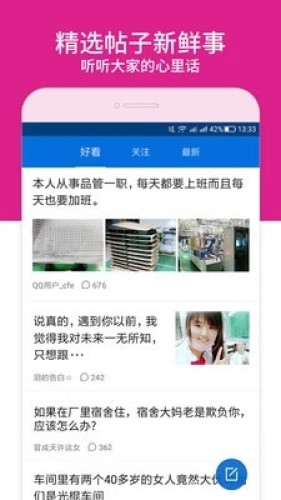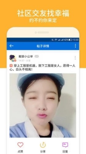 80,90后工友同厂恋爱,兴趣交友社区。无数同城女生,附近帅哥等你约会。找工作,找朋友,找对象,找闺蜜,找老乡,找兴趣,看笑话,聊糗事,找美图,秀恩爱。