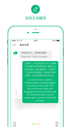 「彩云小译」是一款能做到你边说,我边译的同声传译产品,就像一位真人翻译官藏在您的手机里。目前支持中英文,翻译速度快,准确度高,且地道口语化。带上小译,在工作场合、出国旅游、与外国友人聚会时,语言不再是您表达自我的障碍。目前产品刚刚发布还不成熟,非常希望大家多给我们提意见xiaoyi@caiyunapp.com
