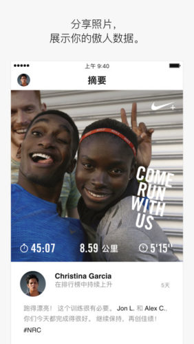 通过添加照片、跑步数据和贴图,个性定制你的分享帖,你可以选择分享给 Nike+ 好友或同步到其他社交平台。