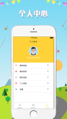 4.个人中心:提供收益查询、收益提现、投资详情等查询,获取单车状态等信息。