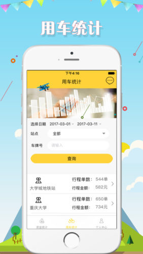 2.用车统计:提供经营核心数据,包括站点用车统计、单车用车统计、单车用车详情等;