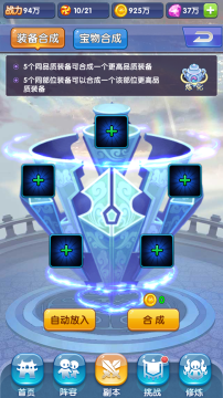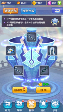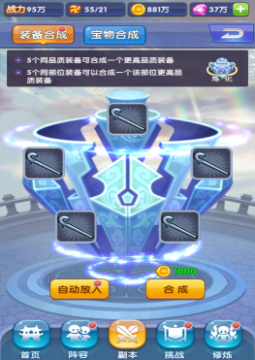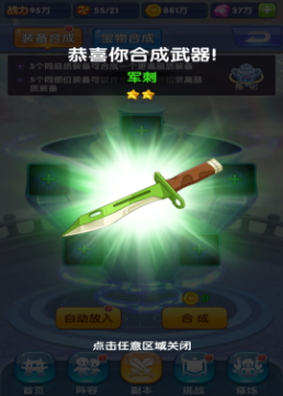 2、5个相同部位的装备可以合成出1个同样部位的装备且品质更高。游戏里装备的品质也用颜色来区分,最低从绿色开始,蓝色,紫色,橙色,红色,最高是金色。合成功能最贴心的地方就是让每个看似过时的装备都变得有用了,给每一位玩家希望。