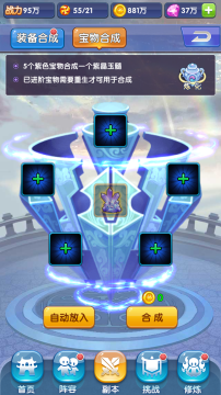 宝物合成在33级开放。5个紫色宝箱可以合成出一个精华宝石,精华宝石又可以用于宝物的进阶。这个游戏很多道具都不仅仅是出售这一种消耗方式的,很多时候玩家不用的道具也可以变废为宝的。合成就是资源回收再利用的过程,我们的目标是:没有浪费!