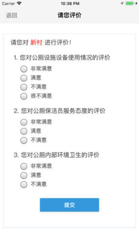 第五步:点击“评价反馈”还可对公厕设备的使用情况、公厕保洁员的服务态度以及公厕内部的环境卫生进行评价,让每个市民都能监督公厕的卫生情况。
