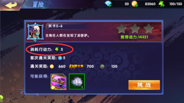 1、普通关卡,每一关消耗5点行动力