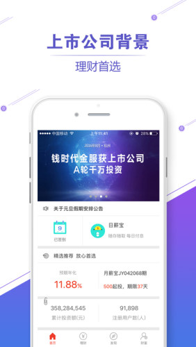 钱时代,上市公司旗下互联网金融理财平台,专属您的理财管家。理财产品年化收益7%--15%,周期灵活。其中短期理财产品日薪宝,1元起投,随时可提现,每日付息。可满足用户短期理财的需求,是您理财赚钱的首选理财app。