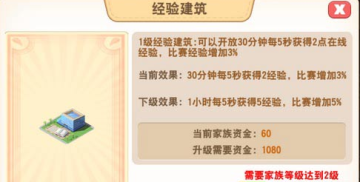 玩家加入家族之后,可以建造经验值建。经验值建筑不仅在每次比赛中可以使得玩家获得额外的经验值,也可以开启在线经验值BUFF挂机获得经验值。