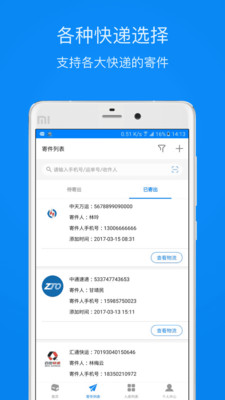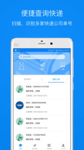 1、查询:支持各大快递查询和导入,还可以扫描录入快递单号,支持包裹备注,使快递的管理一目了然;