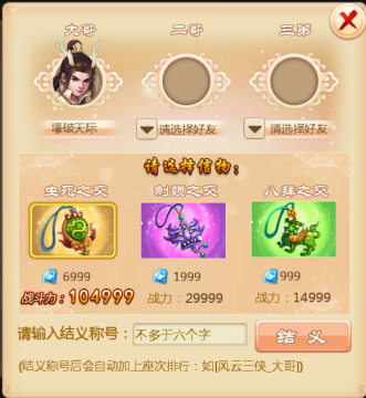 3.消耗的钻石由发起结义人支付,支付者默认为大哥;而二哥、三弟则由大哥根据邀请的位置决定(结义成功后会根据性别变换称谓)