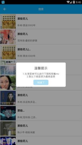 音乐助手能下载免费音乐的软件,是从右往左划动才可以下载或看MV,能听音乐能看MV的神器!