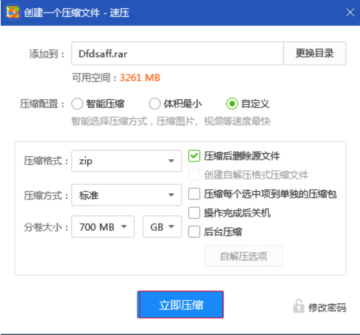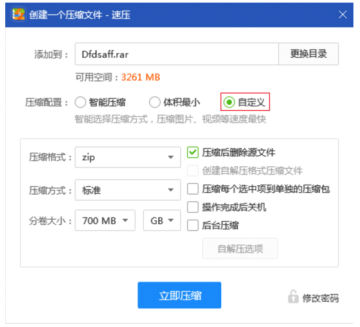 这时候会弹出一个压缩文件的窗口,里面有智能压缩、体积最小、自定义三种压缩配置。选择好压缩选项后,点击立即压缩即可。