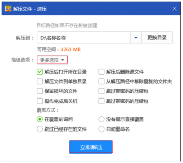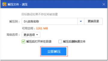 在弹出的窗口中,我们就可以进行压缩文件的解压操作了。可以直接点击立即解压按钮进行快速解压,也可以在高级选项中进行更多的选项操作,再进行文件的解压。