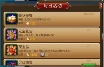 每日活动不仅可以领取体力奖励,还可以获得银币、战功、竞技币和大量的经验奖励,每天都可以参加的哦!
