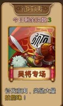 征蛮夷玩家等级在达到20级进入初级,26中级,36高级,48超级,56地狱征蛮夷活动副本该副本的额外奖励条件和固定奖励与之前的平叛乱不同副本依然会随着阵营上当天指定国家武将人数的上升而提高额外奖励但固定奖励为武将技能升级所有的技能珠以及银币箱子根据上阵指定国家将领人数越多给的越多的奖励是武将碎片包几种奖励也都是对于玩家们来说必不可少的资源,千万不要忘了每天把次数用光。