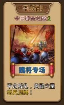 平叛乱玩家可以在等级达到11级进入初级,24中级,34高级,44超级,54地狱平叛乱的活动副本是获得增加武将携带士兵数上限的增兵令的最佳场所额外奖励中还可获得升级武将技能必备的技能珠和道具箱子建议主公们根据当前战斗力攻打对应关卡,避免浪费次数(失败是没有奖励的)每天可攻打两次,根据当天指定国家武将上阵人数的变化,奖励也会发生改变不单单可以拿到对应难度的固定奖励,还会根据当天指定国家武将上阵人数的提升而增加额外奖励。