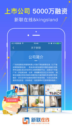 新联在线是由来自新加坡和中国的金融及互联网专业团队成立的全球化互联网理财平台,总部设于中国广州,并在新加坡、台湾地区设立分支机构。自2013年7月成立以来已有超过5万位投资者。累计成交额7亿元。