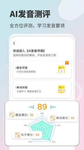 - AI发音打分:可亲自朗读日语50音图、日语单词、日语短句,给你的日语发音AI智能打分。