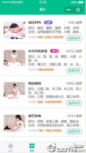 2、服务列表:按照需求选择合适的项目,系统会推荐距离最近的可接单技师为您提供上门按摩服务;