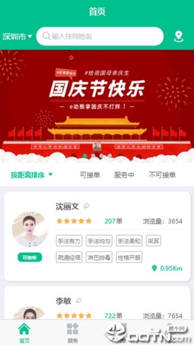 1、技师列表:根据地图和定位,按照距离为你推荐最近的技师,快速提供上门按摩服务;