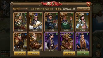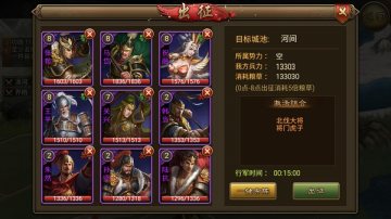 1、在主界面点击任意一座属于自己的“城市”点击部队按钮即可以进入部队系统,以卡牌形式呈现的武将正在等待主公的命令。点击相应头像即可详细部署兵力,可以看到一键补兵,一键解散兵力运输,点击相应武将,可查看这个武将的体力、技能、攻击防御等详细属性;点击左上角的阵号兵,还可查看部队在兵种、阵营、称号上获得的加成效果。