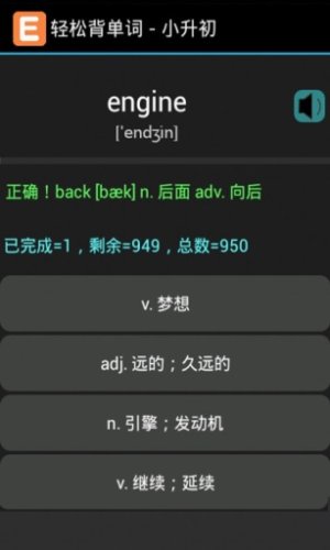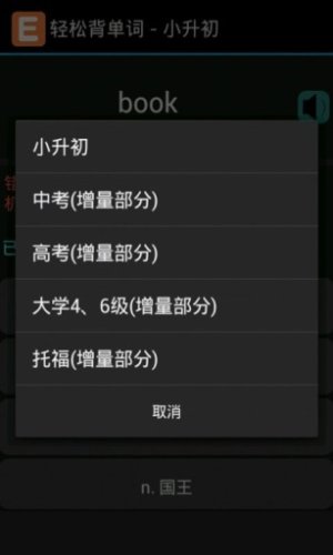 轻松背单词,分为小升初、中考、高考、英语4、6级、托福五个级别。