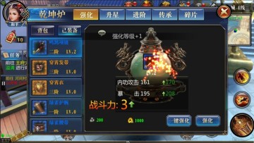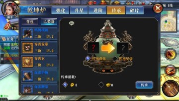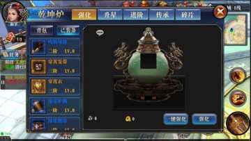 在乾坤炉界面中,可以对装备进行强化、升星、进阶、传承等操作。