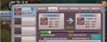 1、消耗道具宠物口粮可提升宠物成长经验值,经验值达到100时,成长等级提升一个等级。提升成长等级,可增加宠物的攻击、命中以及暴击。