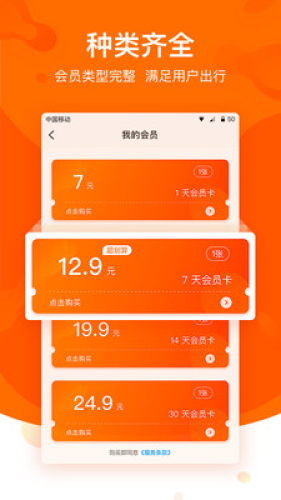 会员形式灵活,提供1天、7天、14天、30天会员卡,满足广大用户出行灵活度。