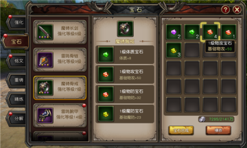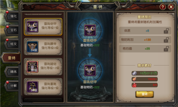 装备系统可进行装备强化、装备重铸、装备精炼、装备分解和宝石镶嵌