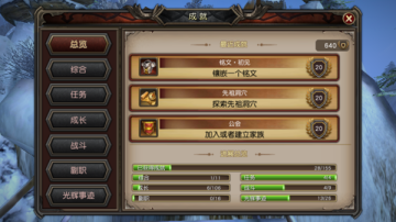 成就分为综合类,任务类,成长类,战斗类,副职类,光辉事迹类