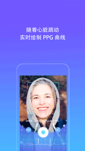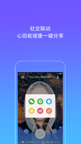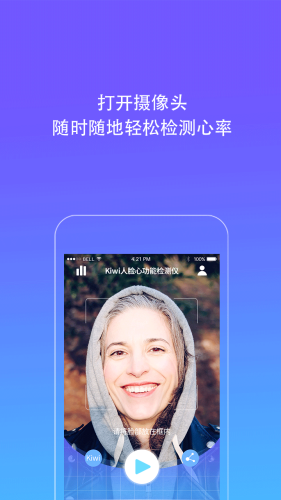 "Kiwi人脸心率检测仪"无需其他外设,只利用手机前置摄像头,就让您随时随地轻松检测当前心率和呼吸。同时该软件还提供测试结果记录与分享。