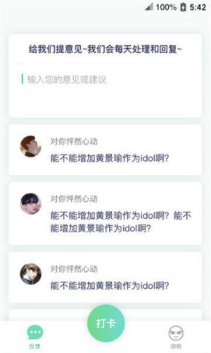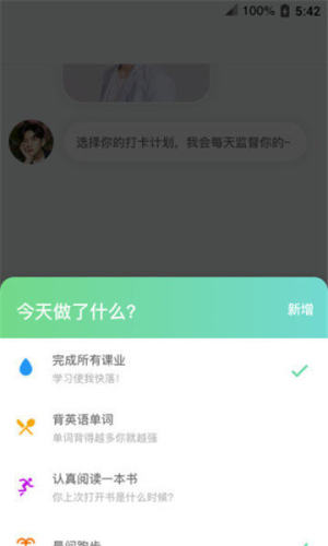 在爱豆打卡,你可以设置你*喜欢的虚拟角色,监督你每天学习,跑步,健身。同时,他还能每天和你聊天,提醒你完成任务,像虚拟的男友女友一样陪伴你。