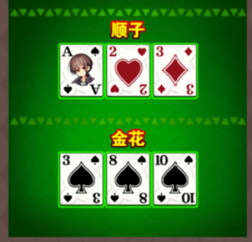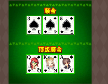 顶级顺金:扑克牌为【Q、K、A】且花色也相同的组合。