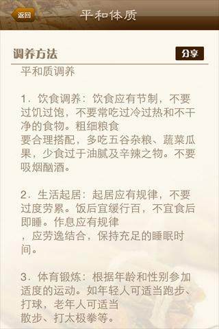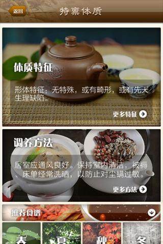 您了解您是哪种体质吗?根据《中医体质分类与判定》标准,中医体质分九种:平和质、气虚质、阳虚质、阴虚质、痰湿质、湿热质、血瘀质、气郁质、特禀质。(《中医体质分类与判定》是我国*部指导和规范中医体质研究及应用的文件,旨在为体质辨识及与中医体质相关疾病的防治、养生保健、健康管理提供依据,使体质分类科学化、规范化。)本应用为您提供不同体质的判断方法,然后根据不同的体质为您量身打造四季不同的养生及食疗方法