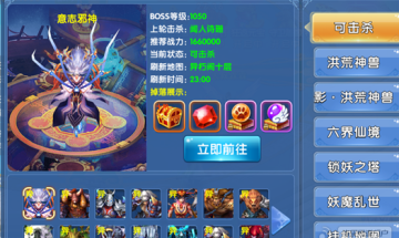 洪荒神兽:这里显示的boss都在异朽阁,异朽阁每层都会有boss,而且随着你等级的提高,异朽阁的层数也会逐步开放,让你能挑战更强的boss和获得更好的奖励!要注意的是这里的同等级段boss是需要组队才能击败的强力boss