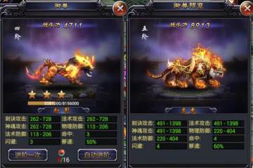 御兽能够带来属性和战斗力上的增长,同时乘骑御兽能够带来移动速度的极大提升。玩家通过获取妖灵丹来升级御兽。