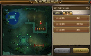 燕王古墓和秦皇地宫一样分为四层,需要玩家等级达到25级,45级,60级和75级可以进入。怪物的经验值获取比秦皇地宫略低,但是也要高于野外地图的怪物。其中怪物刷新的数量是非常多的,在秦皇地宫争夺激烈的情况下,可以选择燕王古墓刷怪。