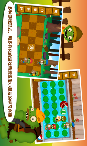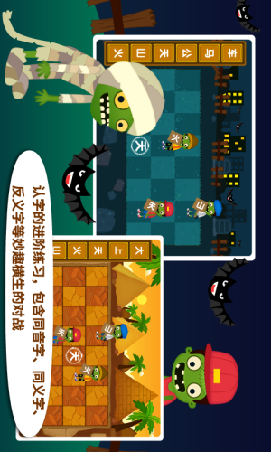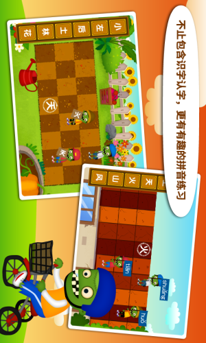 - 每个知识点都有一个独特的场景,孩子利用自己掌握的汉字知识与不同的僵尸对战,保卫自己的领地;