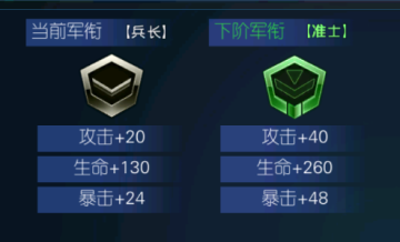 其次,《荣耀先锋》的军衔系统中提升军衔可以带来攻击、生命、暴击属性的提升,