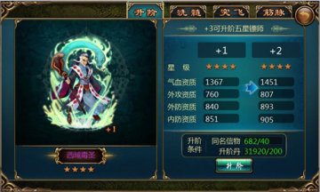游戏中,大家最多可将14名镖师招至麾下,并可最多选4名镖师与自己组成5人阵出战。镖师有气血、外功/内功、外防、内防四项主要战斗属性,还有猛击、韧性、身法、命中、异攻、抗力六项辅助属性。镖师的四项主要战斗属性的基础值由对应的天生资质决定,资质越高基础属性越高。当然,习武不易,想要在战斗中使用镖师技能,还需要努力习武掌握。镖师进阶可以说是无压力的,只要主角获得经验得到升级,镖师也会自动跟随主角升级。当然,假如大家希望更加快速的提升,通过“突飞”消耗经验书也能如偿所愿。