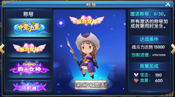 4)称号的获取方式有等级,有战斗力,有竞技场排名,有女神竞选活动多种多样,只要努力获得所有称号都是可以的。而且激活的称号加成效果是叠加的,获得越多的称号,就获得越强的属性哦。