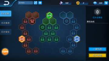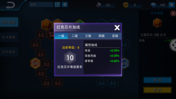 芯片装配界面中,玩家可以看到中间红绿蓝三色的芯片区,芯片区随等级提升开放芯片格。装备上芯片后可以在右边的界面查看属性加成情况。