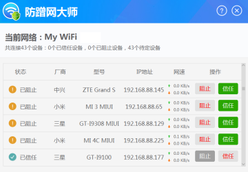 防蹭网大师阻止的是设备上网,并不阻止设备的连接WIFI。只要对蹭网设备做了“阻止”的设置,蹭网设备就没法利用你的WIFI上网了