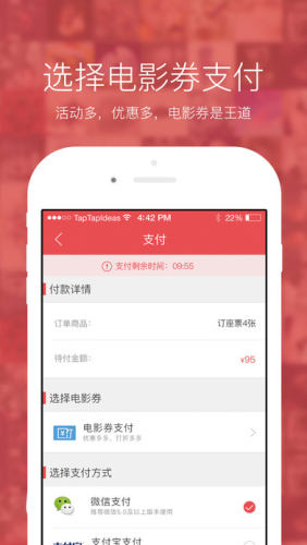 5、“电影卡券支付”功能,让你不用掏现金、随心所欲的买,不再为票贵而烦恼
